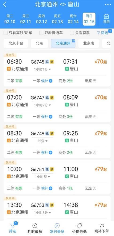 北京站、北京朝阳站的东北方向线路车票也十分紧俏,发往沈阳、哈尔滨、吉林等地的车票几乎开票即秒光,诸多车次甚至已无法提交候补订单。值得一提的是,今年首次加入春运的北京通州站,成为唐山、秦皇岛方向旅客的出行新选择,铁路12306显示,该站有8趟高铁终到唐山、3趟高铁终到秦皇岛,目前这些车次的车票均余票充足。