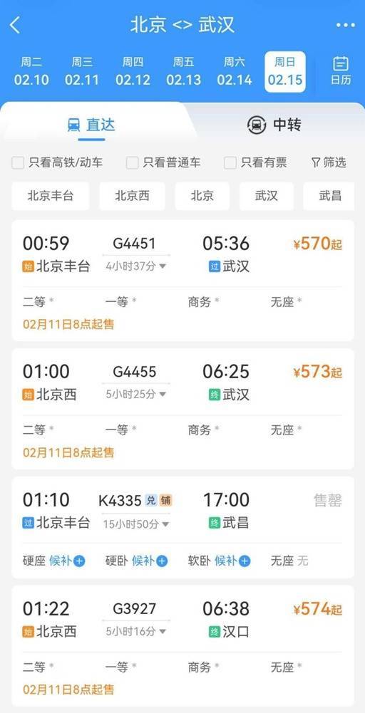 铁路12306显示,2月15日北京丰台站、北京西站将加开4趟发往武汉、汉口方向的夜间高铁,为未抢到车票的旅客提供新选择:G4451次于0点59分从北京丰台站始发,终到大冶北,经停郑州、武汉、黄石;G445次于1点从北京西站出发,6点25分终到武汉站,全程运行5小时25分;1点22分、1点52分,北京西站还将接连发出G3927次、G4453次高铁,分别终到汉口、武汉,全程均运行约5小时。上述4趟夜间高铁的车票,将于2月11日8点正式开售,有出行需求的旅客可重点关注。