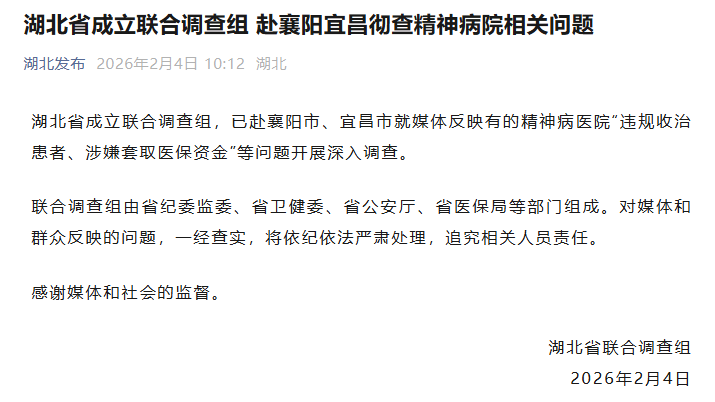 湖北省成立联合调查组,已赴襄阳市、宜昌市就媒体反映有的精神病医院“违规收治患者、涉嫌套取医保资金”等问题开展深入调查。
