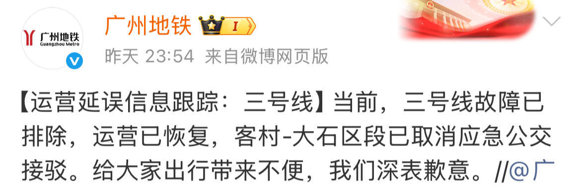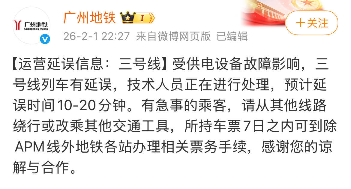 2月1日晚上10点多,广州地铁发布情况说明:受供电设备故障影响配资一流股票配资门户,三号线列车有延误,技术人员正在进行处理。地铁随后启动了应急公交接驳,直到0时,三号线故障才排除,恢复运营。给乘客出行带来不便,广州地铁深表歉意。