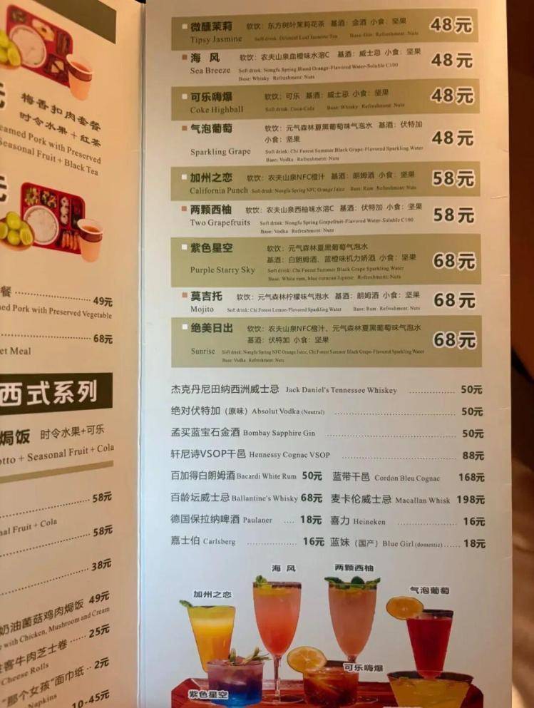 记者注意到,在社交平台上,多名网友都曾发现,上述车次列车新增了鸡尾酒等饮品。菜单显示,鸡尾酒共有9种,既有威士忌+水溶C的“海风”,也有朗姆酒+橙汁的“加州之恋”,这些鸡尾酒的价格从48元至68元不等。